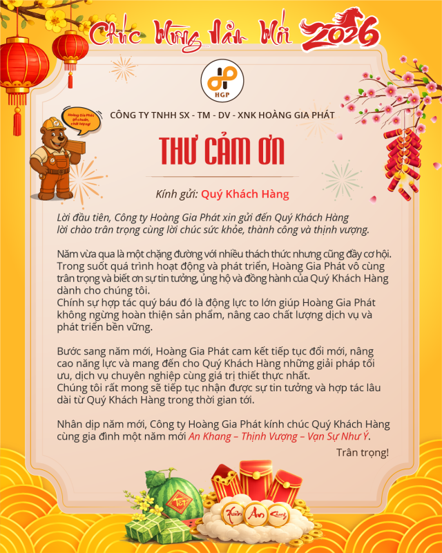 Năm vừa qua là một chặng đường với nhiều thách thức nhưng cũng đầy cơ hội. Trong suốt quá trình hoạt động và phát triển, Hoàng Gia Phát vô cùng trân trọng và biết ơn sự tin tưởng, ủng hộ và đồng hành của Quý Khách Hàng dành cho chúng tôi.